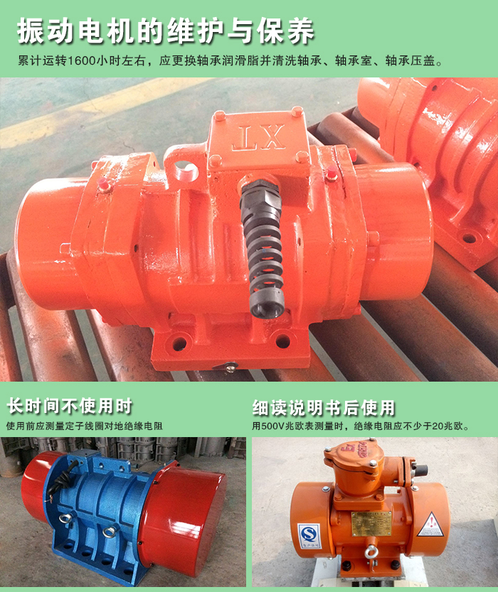 振動電機(jī)運轉(zhuǎn)過程中,必須注意軸承的潤滑。在正常工作條件下,累計運轉(zhuǎn)1600小時左右,應(yīng)更換軸承潤滑脂并清洗軸承、軸承室、軸承壓蓋。